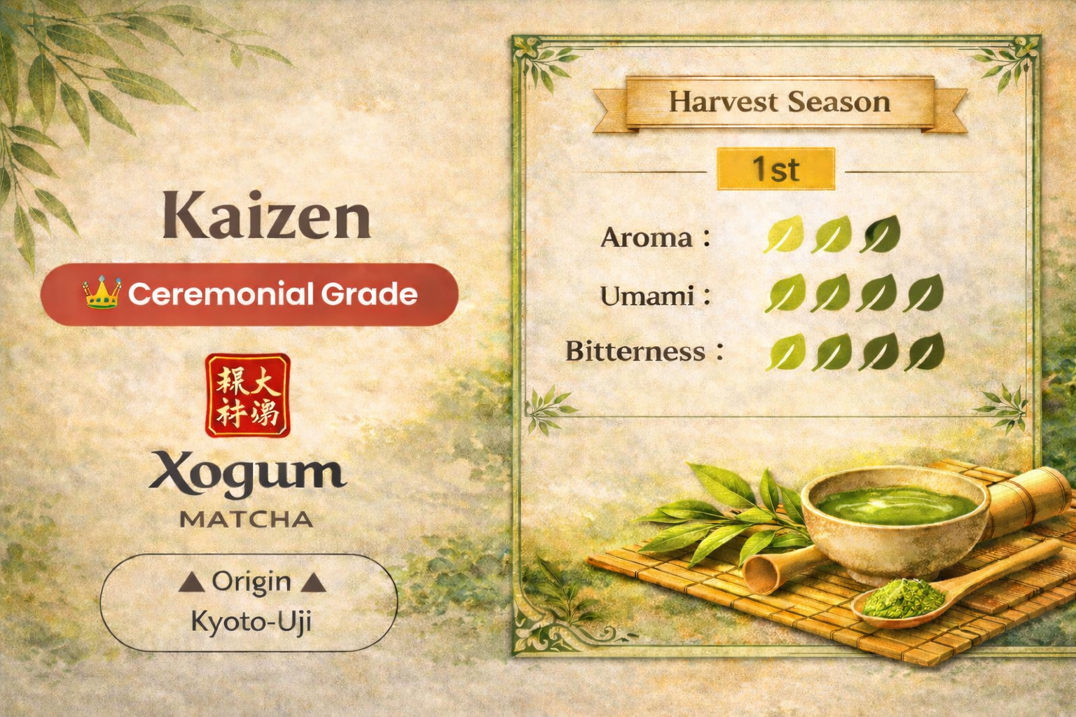 Produzido em Uji, Kyoto, berço do matcha japonês, o Xogum Matcha Kaizen reflete o princípio da melhoria contínua. Com cor vibrante e sabor harmonioso, é ideal para quem procura um matcha cerimonial acessível e consistente.